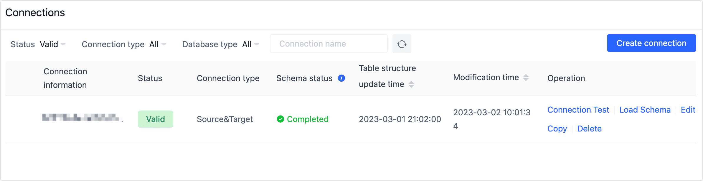 - Copy: Quickly clone a connection with the same configuration based on the specified connection.