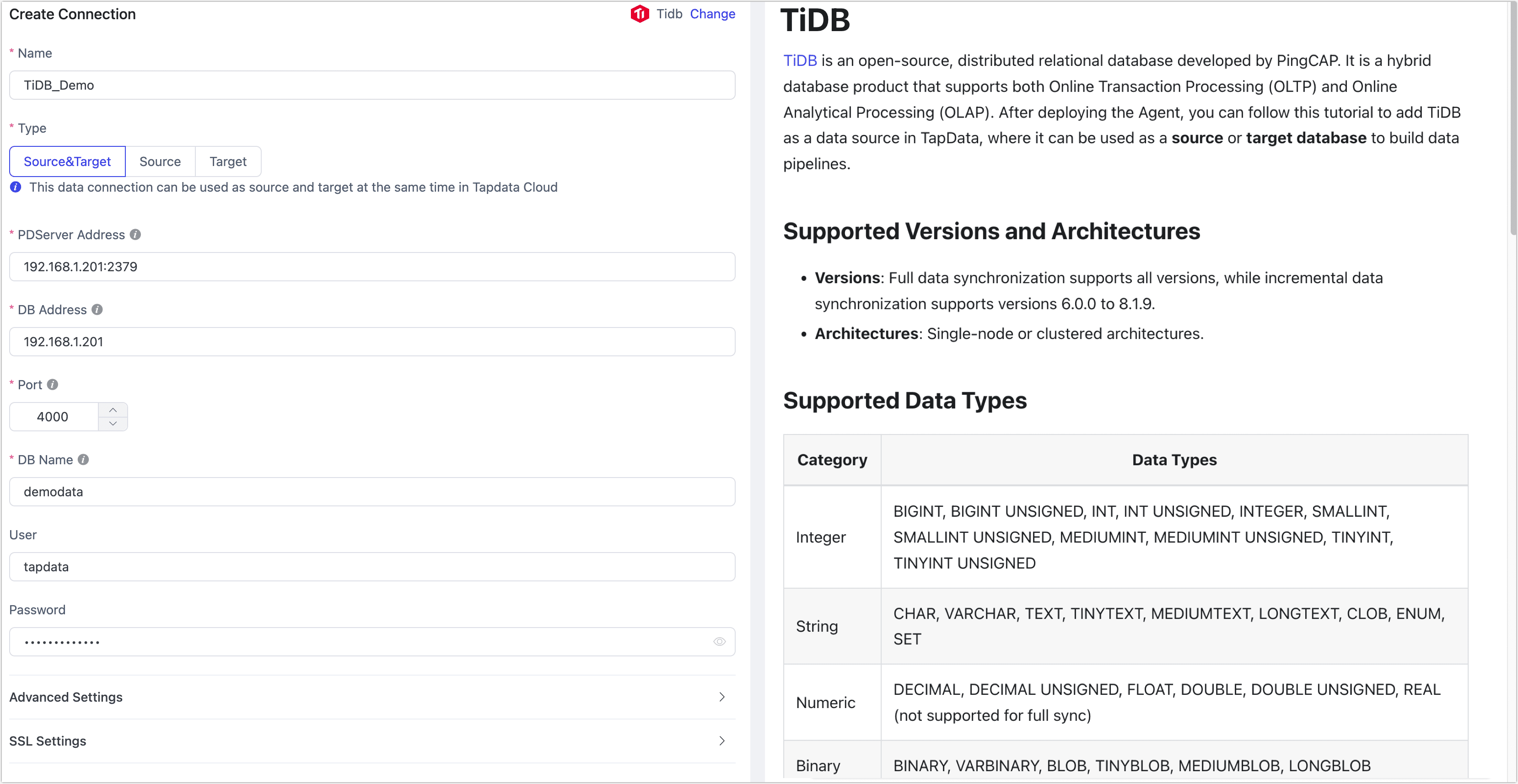 - Type: Supports using the TiDB database as a source or target.