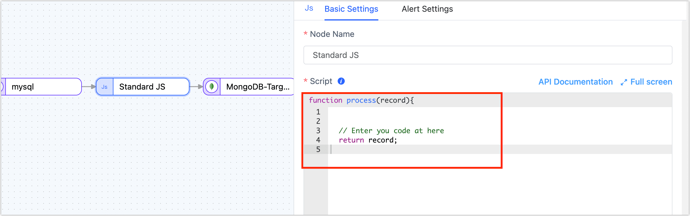 Select a JS node, click the node, and enter the previously copied code. After pasting, write the processing logic you need to execute.
