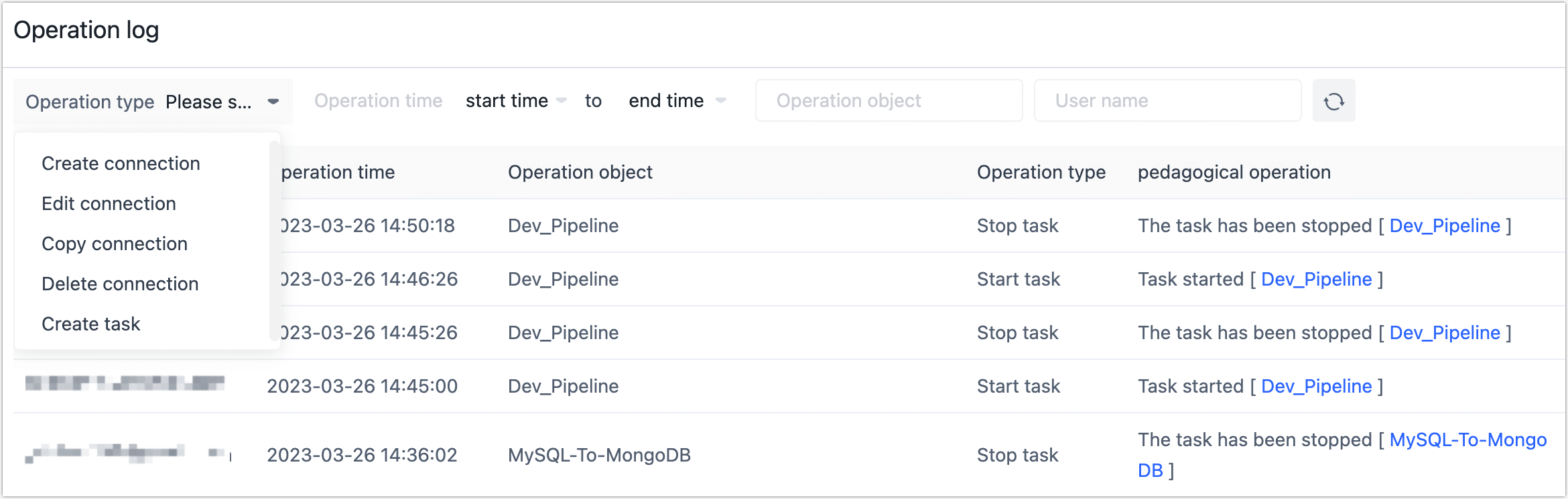 TapData Cloud uses the operation log to record user actions while using the system. You can view the recent activity log and filter the action log by applying the filter.