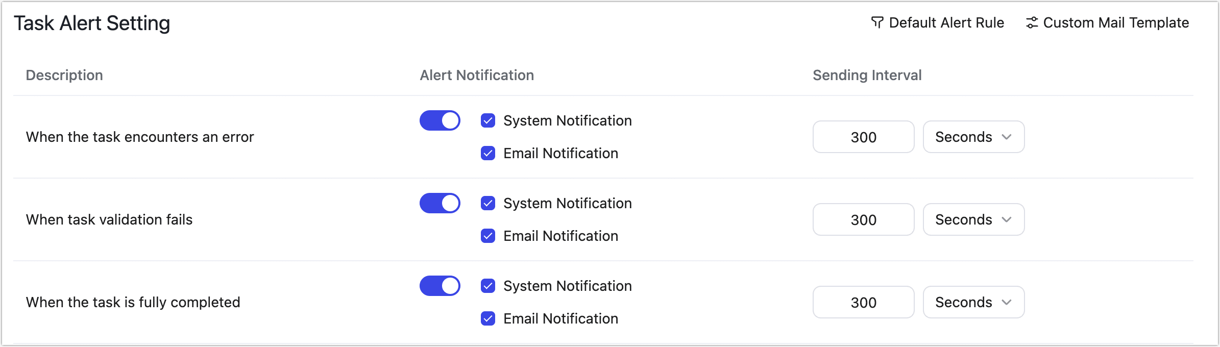 Through alert settings, you can configure alert rules for tasks, nodes, and API services. Notifications can be triggered by various events, with customizable notification methods (such as email) and configurable sending intervals.